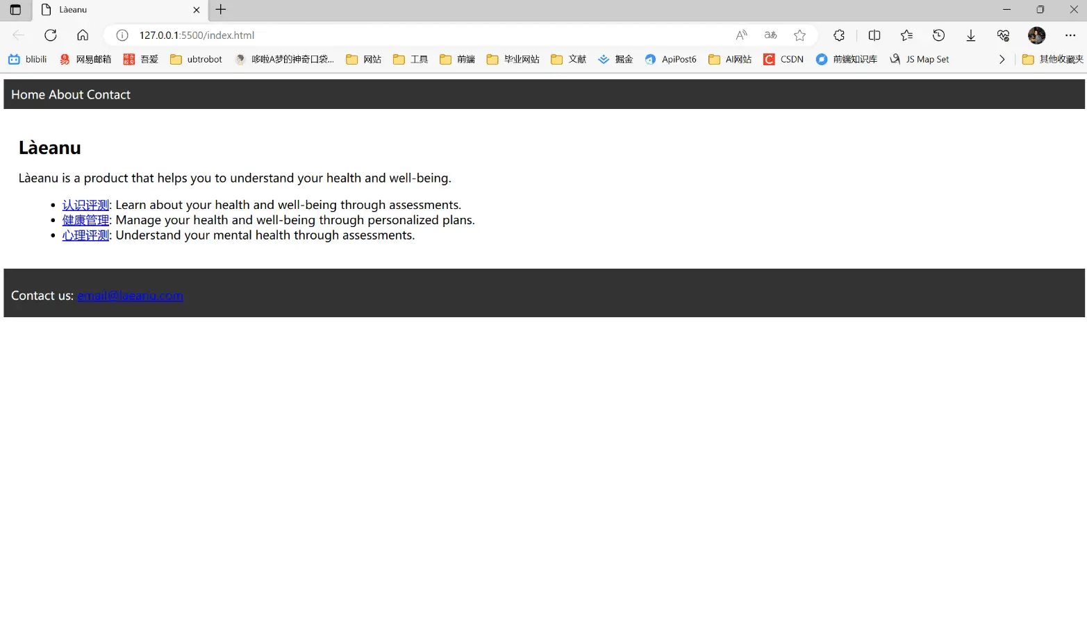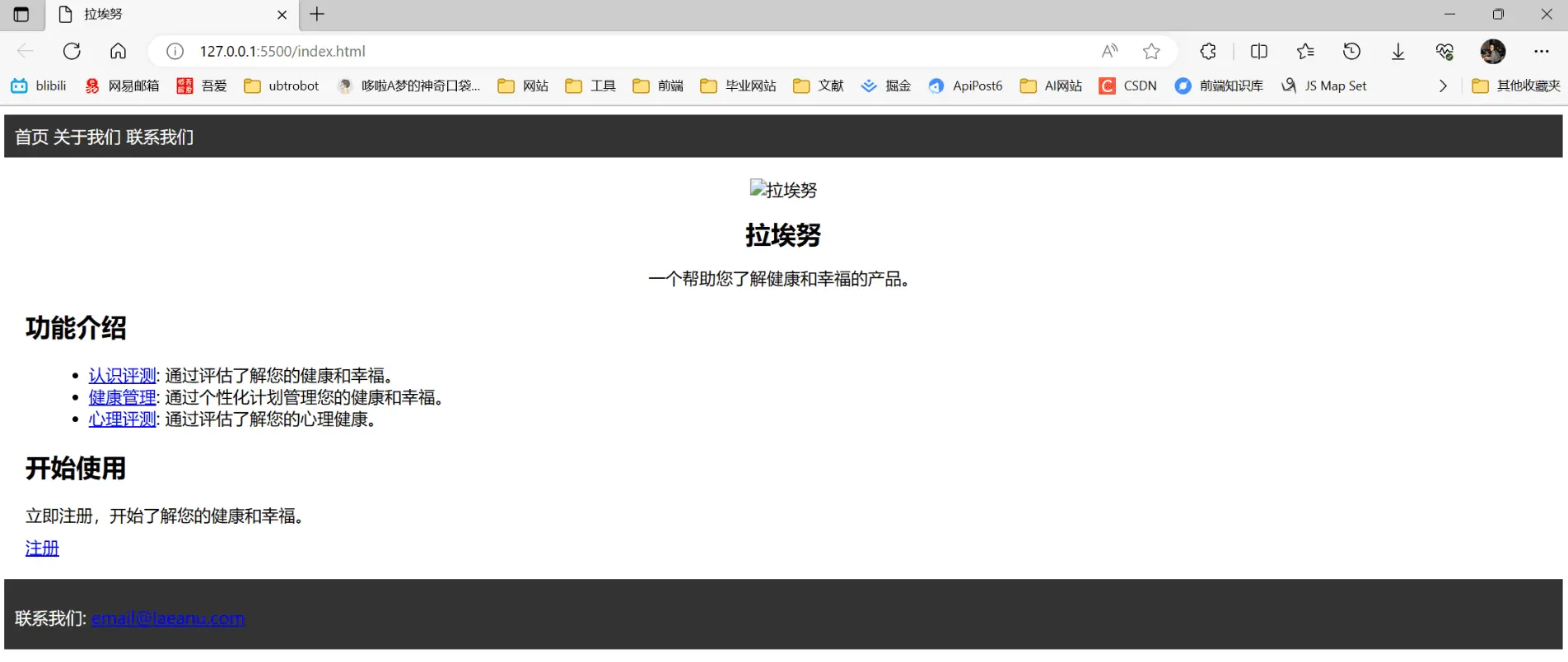 一个介绍认知测评产品网站。网站的顶部是导航栏。网站中心是文字logo。然后有3张图片介绍功能,分别是认知测评、健康测评、心理测评。底部是联系我们。