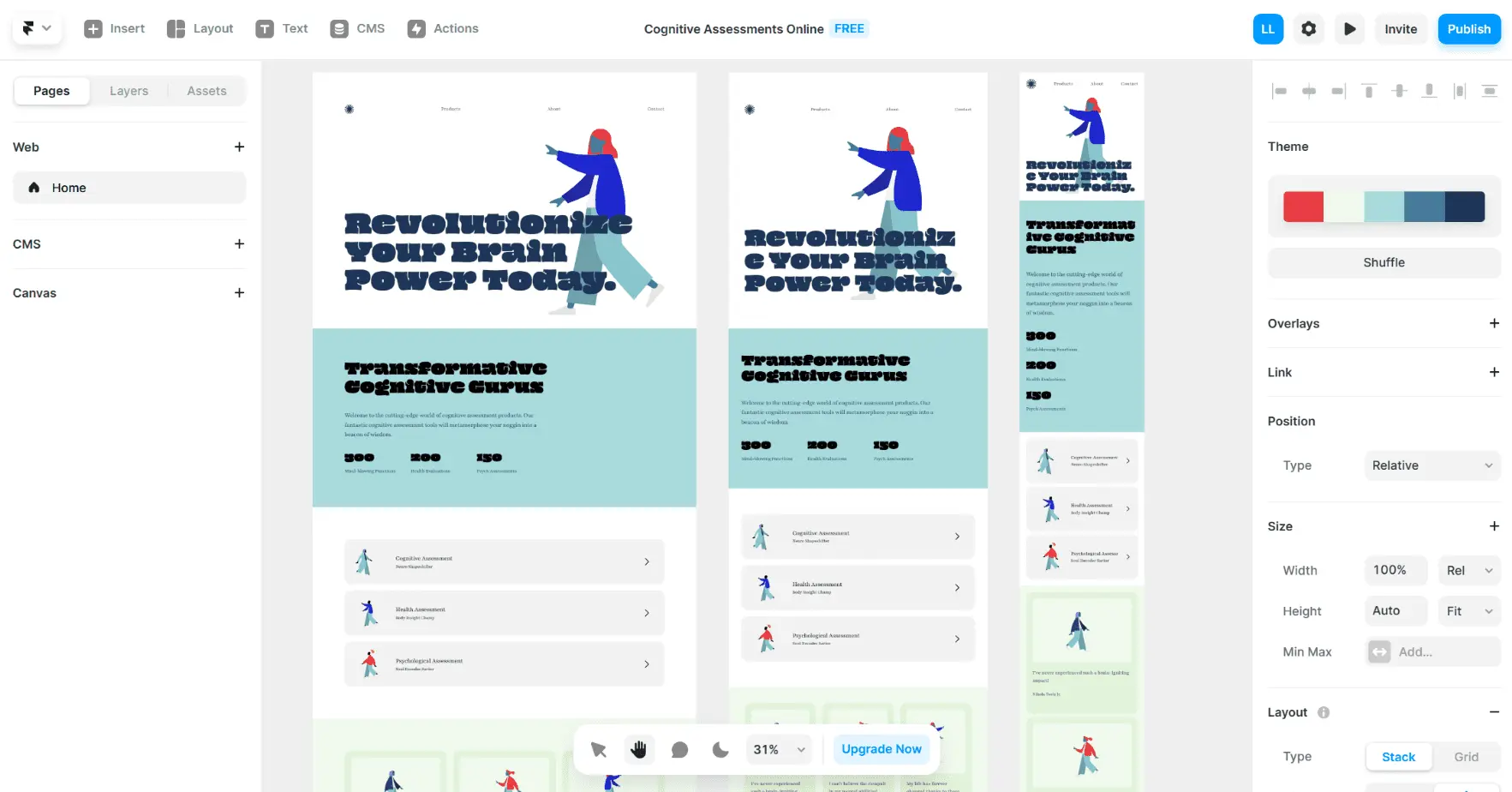 A website that introduces cognitive assessment products. The top of the website is the navigation bar. The center of the website is a text logo. Then there are three pictures to introduce the functions, namely cognitive assessment, health assessment, and psychological assessment. The bottom is to contact us.