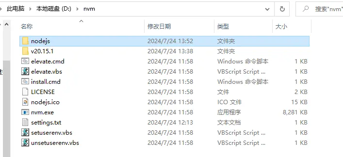 解决办法:先nvm install 一个版本,复制,改名nodejs,比如我这里是复制v20.15.1,再改名。